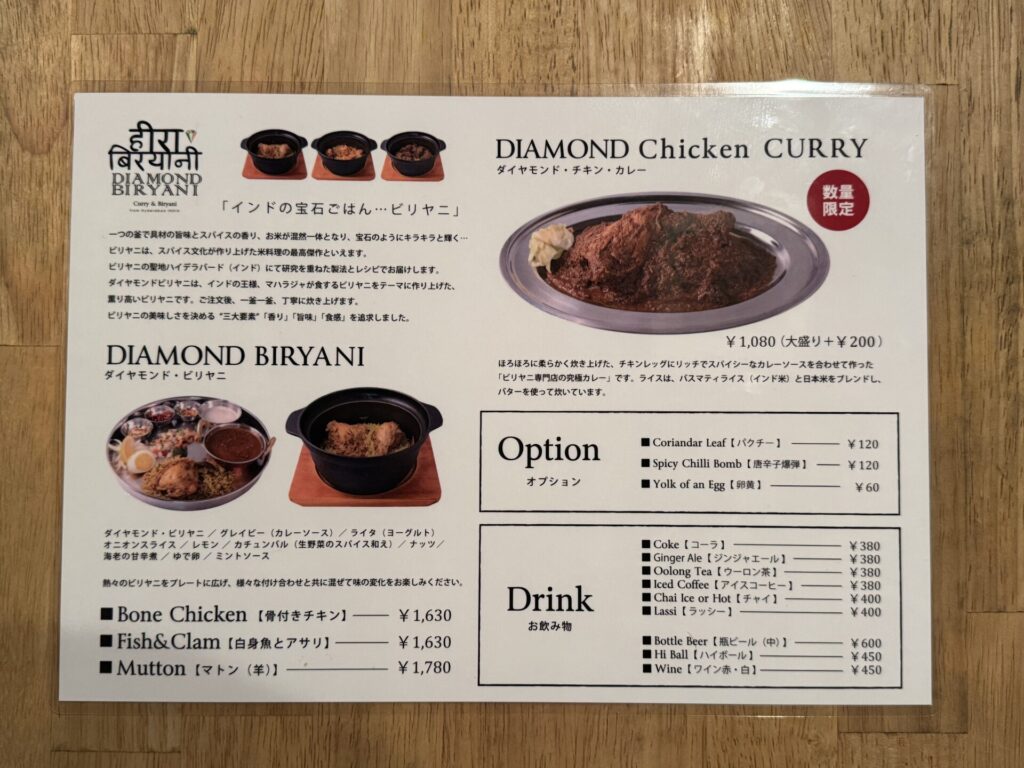 メニューです。ビリヤニが3種類と数量限定でチキンカレーがあるようです。さらにこのときは、このメニュー以外にも海老のビリヤニもありました。