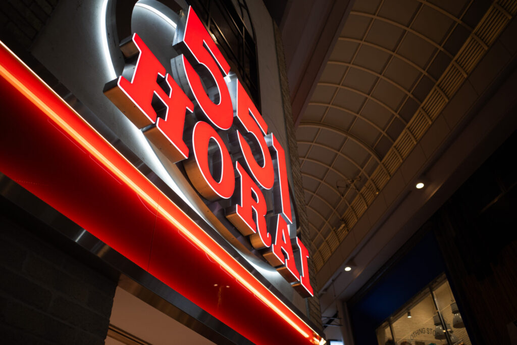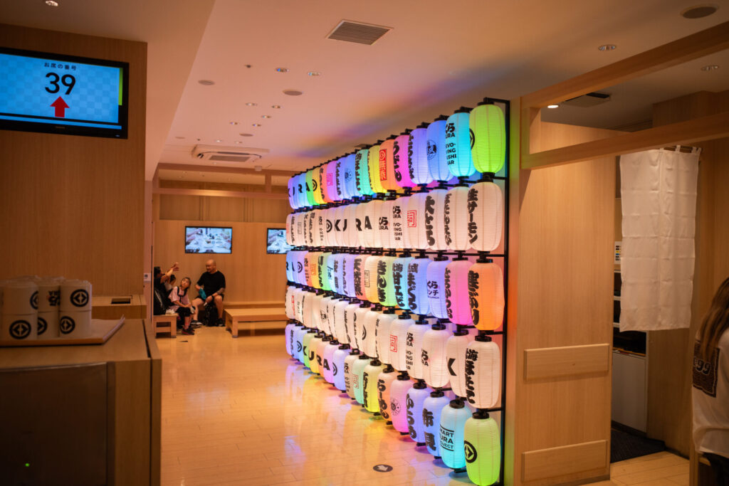 ここ「くら寿司 道頓堀店」は、グローバル旗艦店と位置付けられる特別な店舗です。「浪速の祭り」をコンセプトに、佐藤可士和氏監修の華やかな内装と、AIを活用した完全非接触型のシステムを融合させた、エンタメ体験型の回転寿司店とのことです。