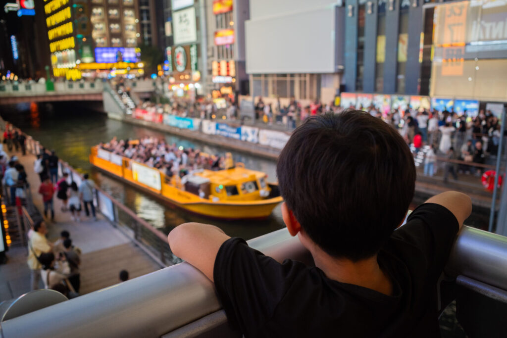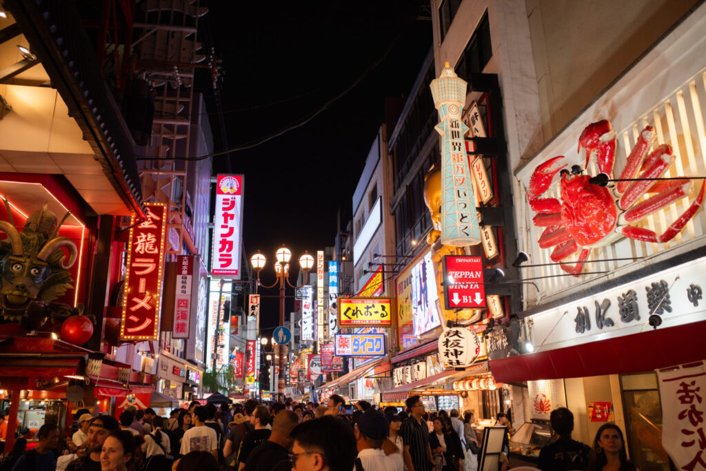 夜になりました。ホテルで少しのんびりできたので、再び道頓堀の散策に向かいました。夜に道頓堀に行くのは初めてです。この時間もとても賑わっていますね。