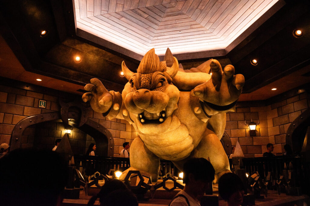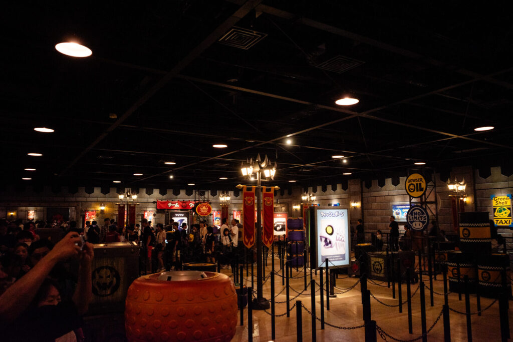 行列の待ち時間は60分くらいでした。朝イチだったのでこのくらいの待ち時間で済みましたが、日中はこの程度では無理です。2~3時間くらいは覚悟しておかないとでしょう。とはいえ、ただ待っているわけではなく、クッパ城の中のいろいろなオブジェを見ながら行列が進んでいくので、待ち時間もアトラクションの一部って感じで楽しかったです。