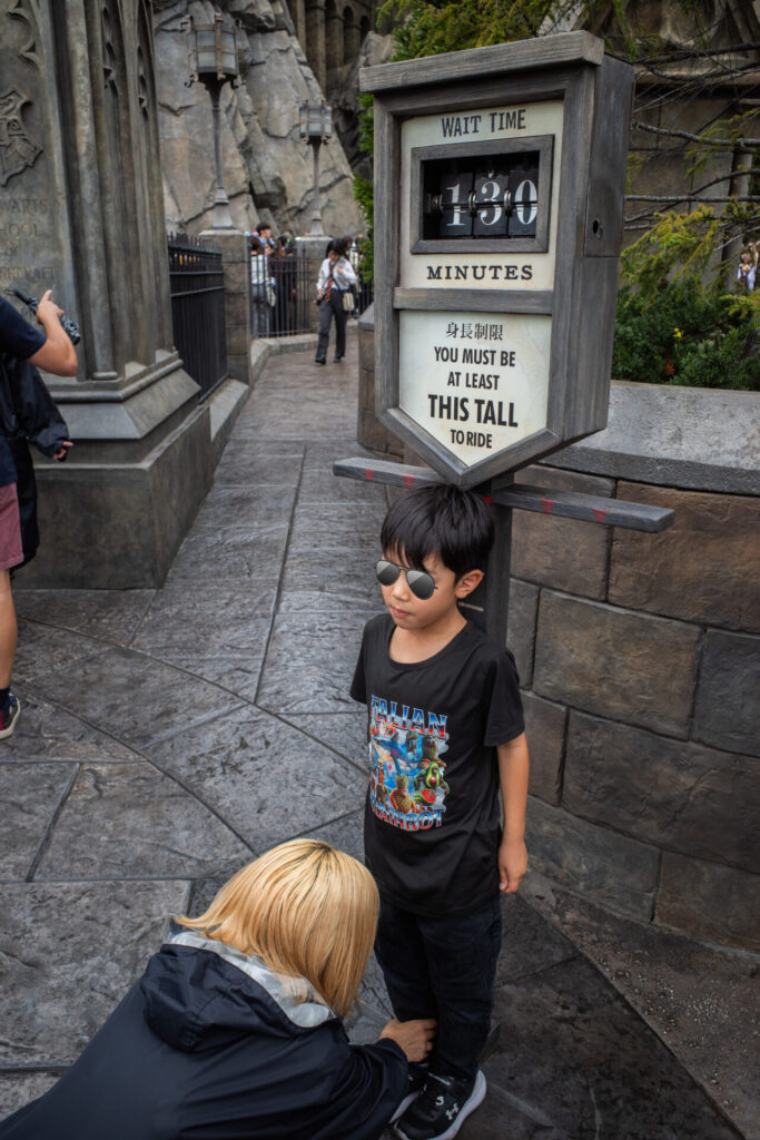 「ハリー・ポッター・アンド・ザ・フォービドゥン・ジャーニー」のアトラクションに行きました。このアトラクションは身長制限があります。同伴者がいてもいなくても122cm以上ないと乗れません。私はいま、ちょうどそのくらいの身長なので、もしかしたら乗れないかもだったのですが、無事身長制限はクリアできました。よかったです。