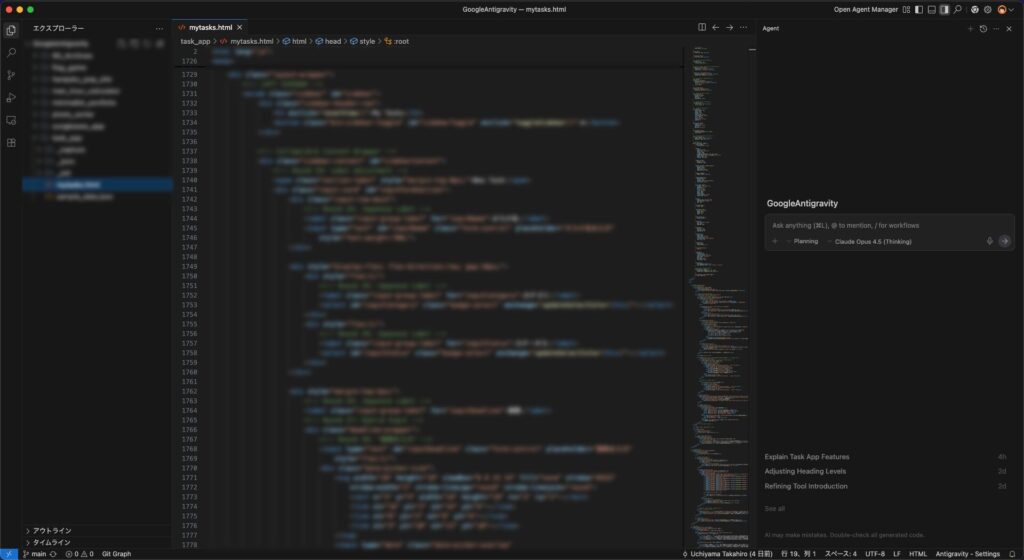 私が使っているのは、Googleが2025年11月に発表したGoogle Antigravityというコードエディターです。