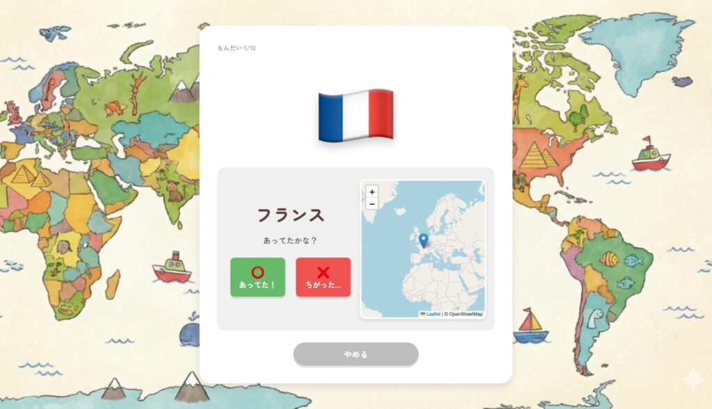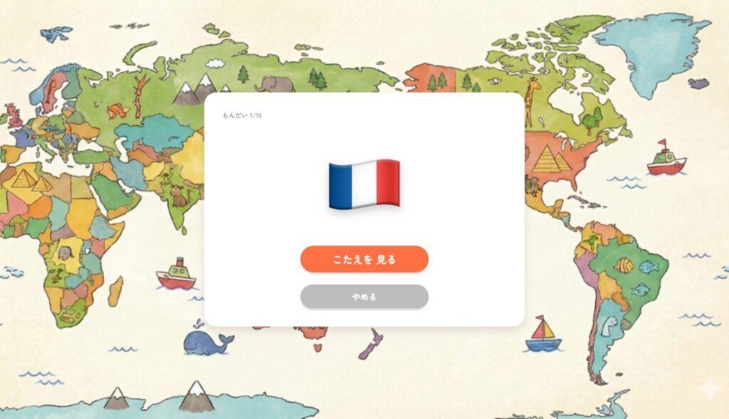 • 地図で答え合わせ — 正解発表時に国の位置が地図上にピン表示。地理への興味も喚起
