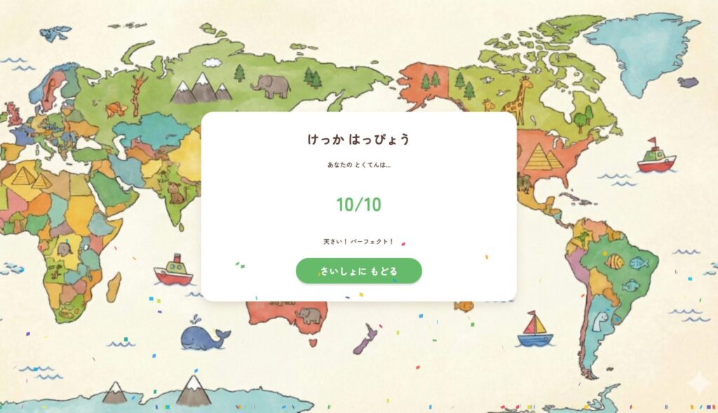 • 楽しい演出 — 正解・不正解の効果音、紙吹雪アニメーションなど