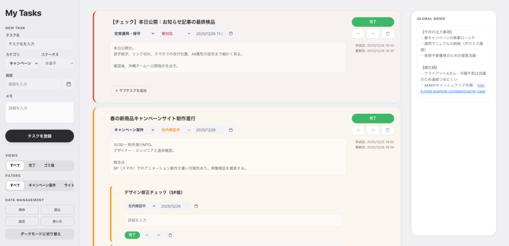 日々のToDoを管理するための、個人用タスク管理ツールです。