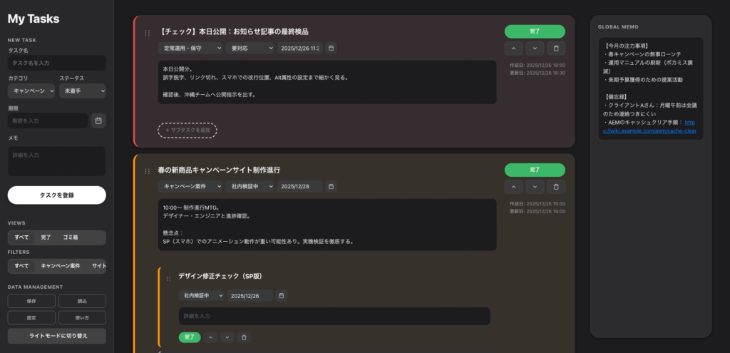 ※キャプチャ内に記載しているタスクはサンプルテキストです