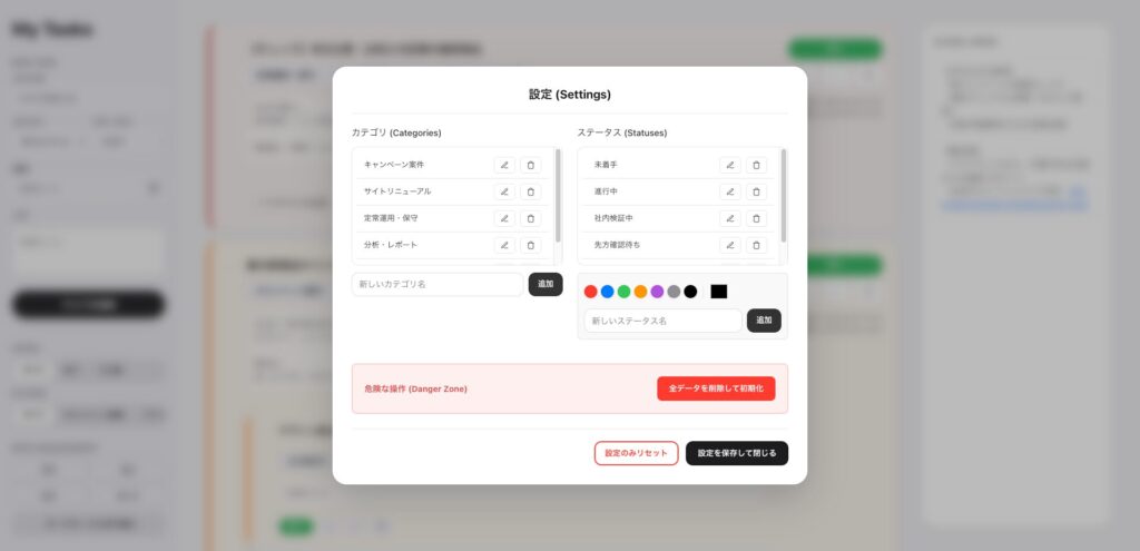 • カスタマイズ — カテゴリやステータスの名称・色を自由に設定