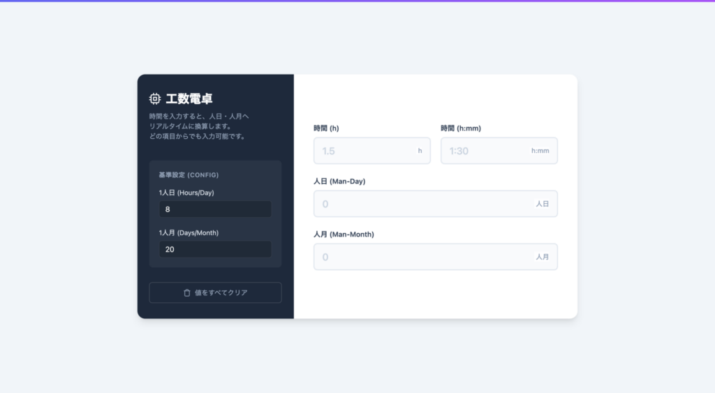 • リアルタイム相互変換 — 「時間」を入力すると即座に「人日」「人月」が表示