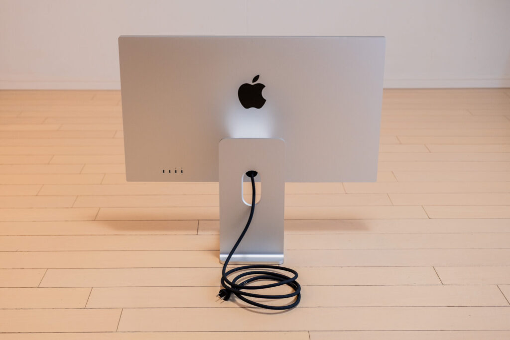 Apple Studio Displayの背面は、シルバーのアルミ素材で仕上げられています。余計な装飾が一切なく、ロゴだけがひっそりと入っているミニマルなデザインです。MacBookやiMacと同じアルミの質感で統一されていて、デスク全体がApple製品でまとまっているような一体感があります。