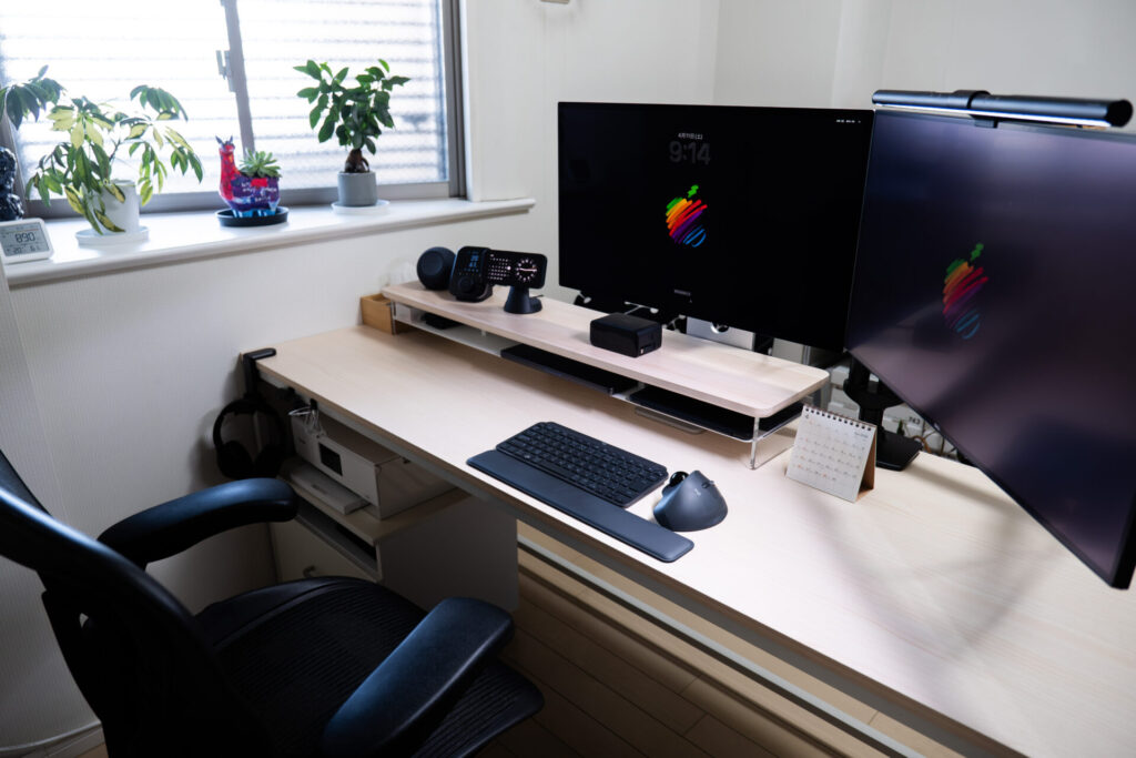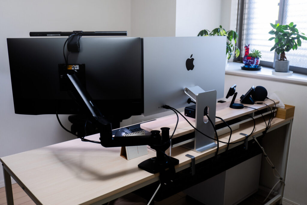 現在はデュアルアームのうち片側にサブモニターを残し、Studio Display側はアームを取り外した状態で使っています。モニターアームならではの自在な位置調整は手放しましたが、背面のシルバーアルミがそのまま見える状態の方が、毎日の満足度がはるかに高いです。