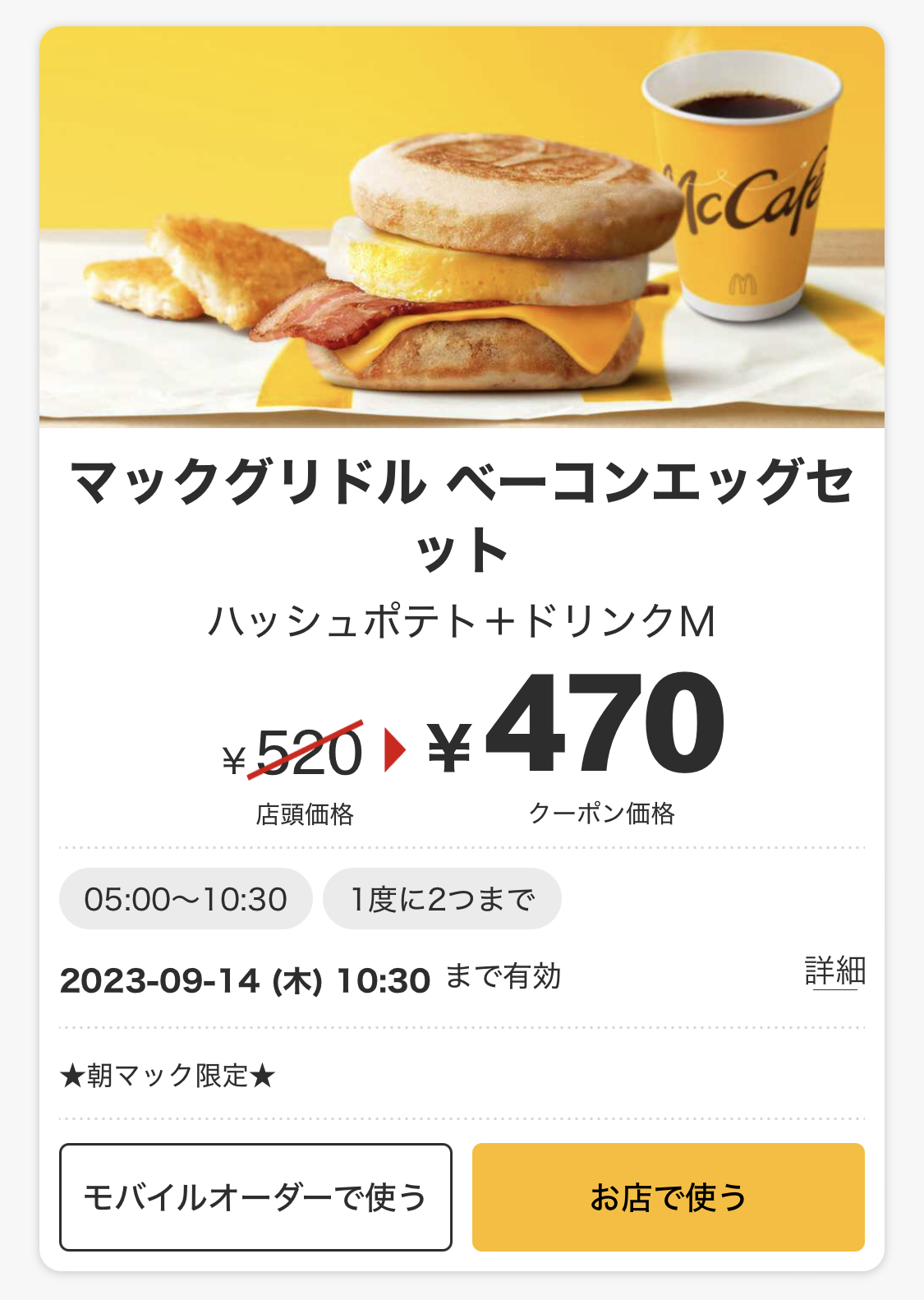 A. 使えます。マクドナルド公式アプリで時間帯に合わせて「朝マック」用のクーポンが表示されます。