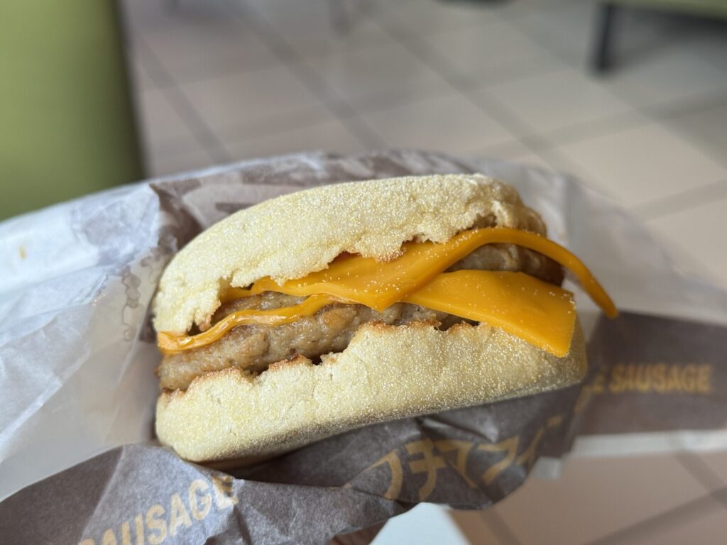 甘じょっぱいメイプル風シロップ入りのパンケーキにソーセージパティを挟んだメニューです。子供の頃からこの「マックグリドルソーセージ」が特に好きでした。人によっては好き嫌いが分かれるかもしれませんが、私の中では「朝マックといったらこれ!」という大好きなメニューです。