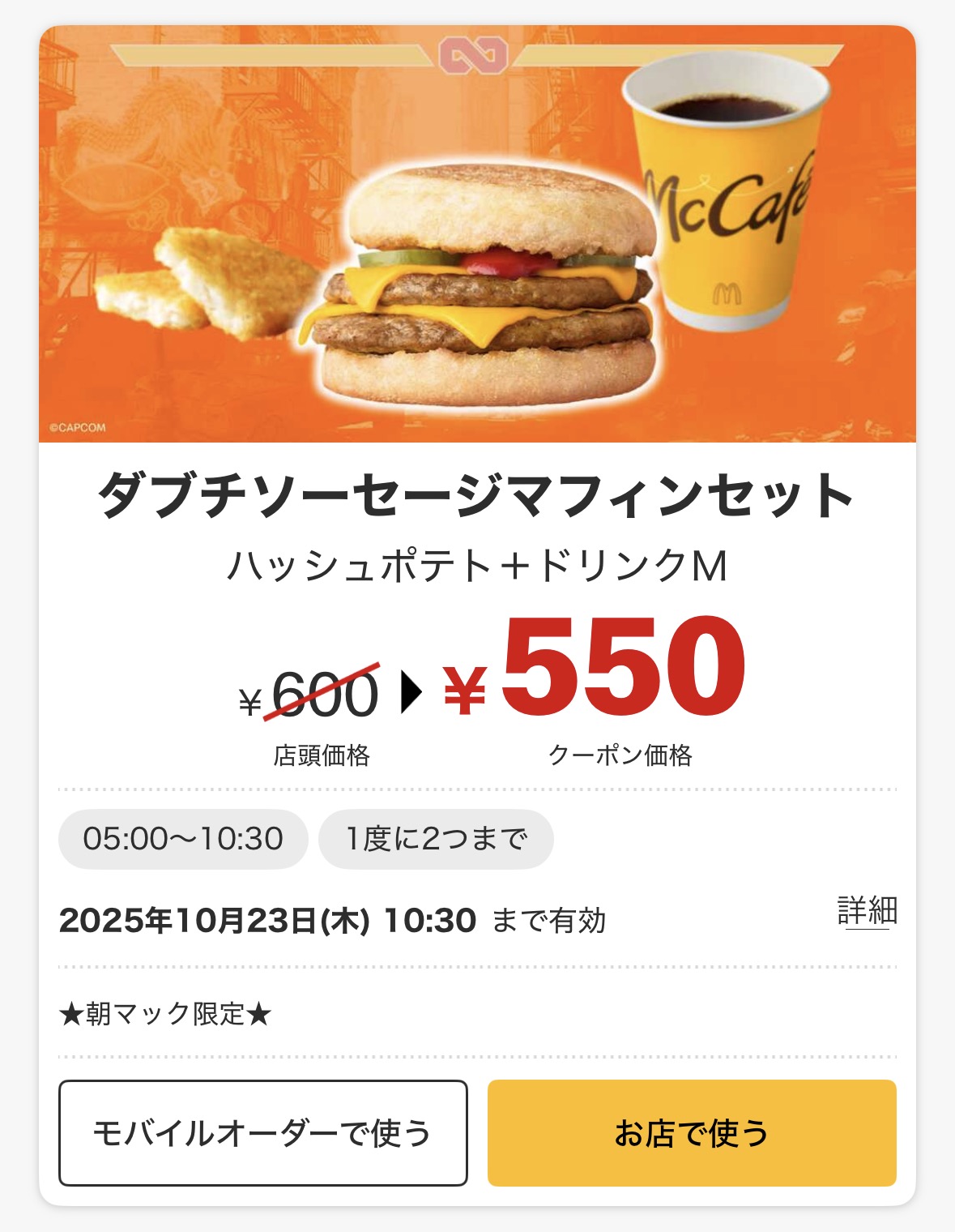 2025年10月23日時点だと「ダブチソーセージマフィンセット」と「ソーセージエッグマフィンセット」と「エッグマックマフィンセット」のクーポンが利用可能です。