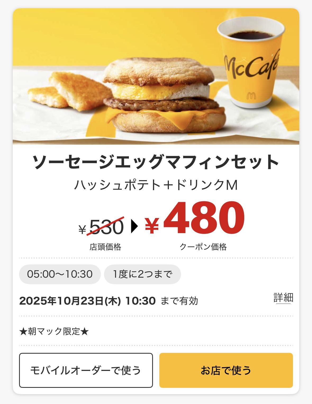 「ソーセージエッグマフィンセット」は通常価格530円がクーポン利用で480円(50円お得)になります。
