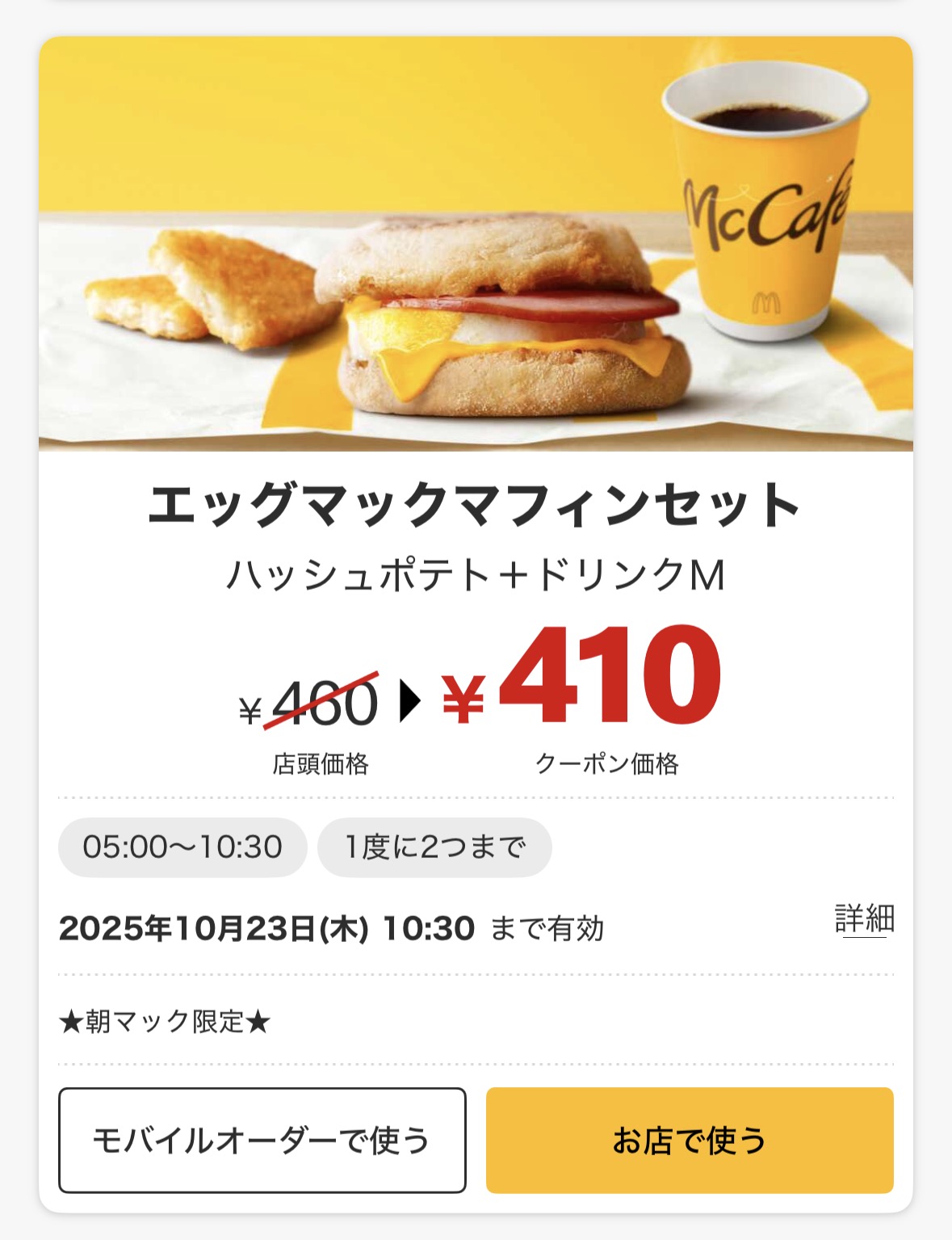 「エッグマックマフィンセット」は通常価格460円がクーポン利用で410円(50円お得)になります。