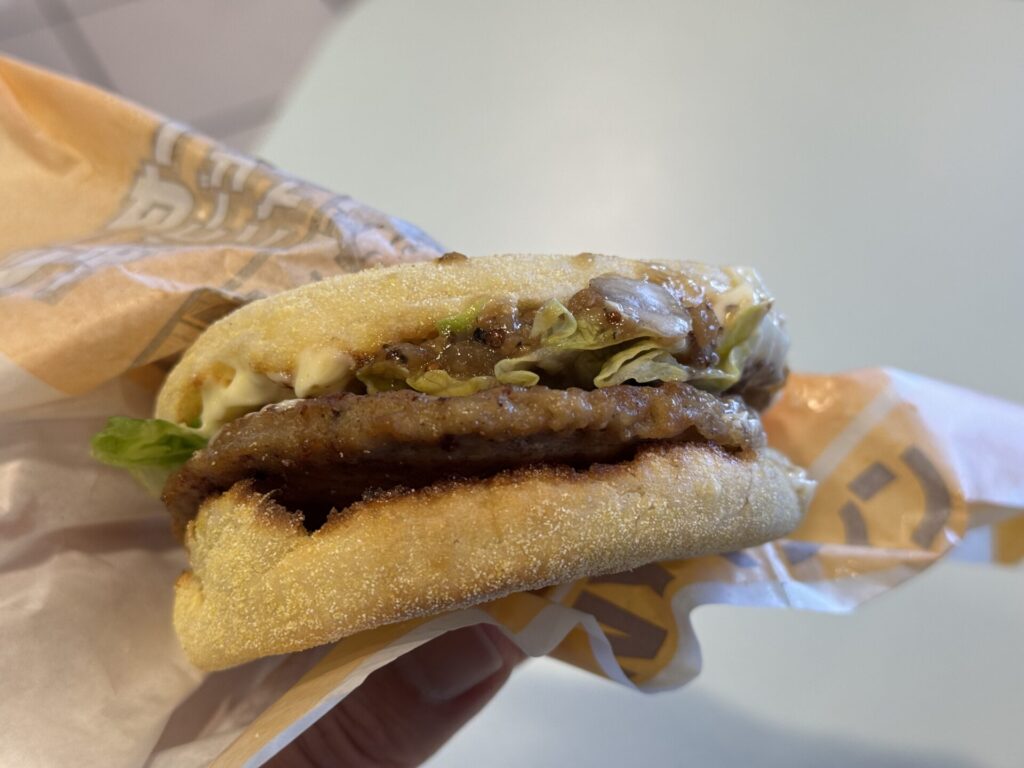こちらはソーセージパティではなく、チキンとレタスを挟んだマフィンです。昼間のメニューだと「マックチキン」に当たります。上記の「マックグリドルソーセージ」や「ソーセージマフィン」はどちらもソーセージパティなので、他の味を食べたいときの選択肢として、こちらのチキンがおすすめです。チキンはマフィンをはみ出すくらい大きいので満足感も高いです。