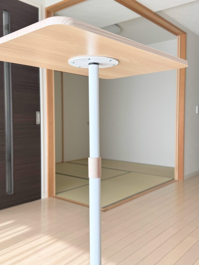 しかし、届いて組み立ててみると、予想以上に質感が良かったです。白っぽい木目調の天板に白いポール。そして高さ調節部分のブロンズカラーがいいアクセントになっています。