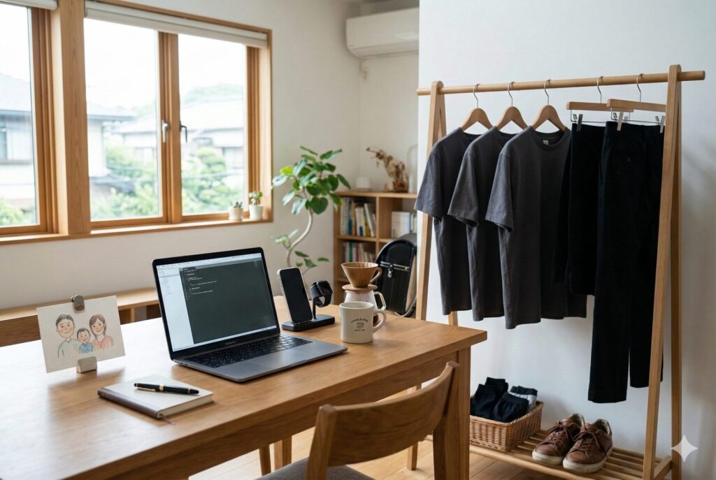 朝の忙しい時間に、クローゼットの前で悩む必要がなくなります。着るものが決まっているから、何も考えずに着替えて出発できる。私の場合、朝は息子を小学校に見送ってからテレワークを始めるのが日課です。この「見送り→仕事」の流れがスムーズになるだけで、朝の余裕がまるで違います。
